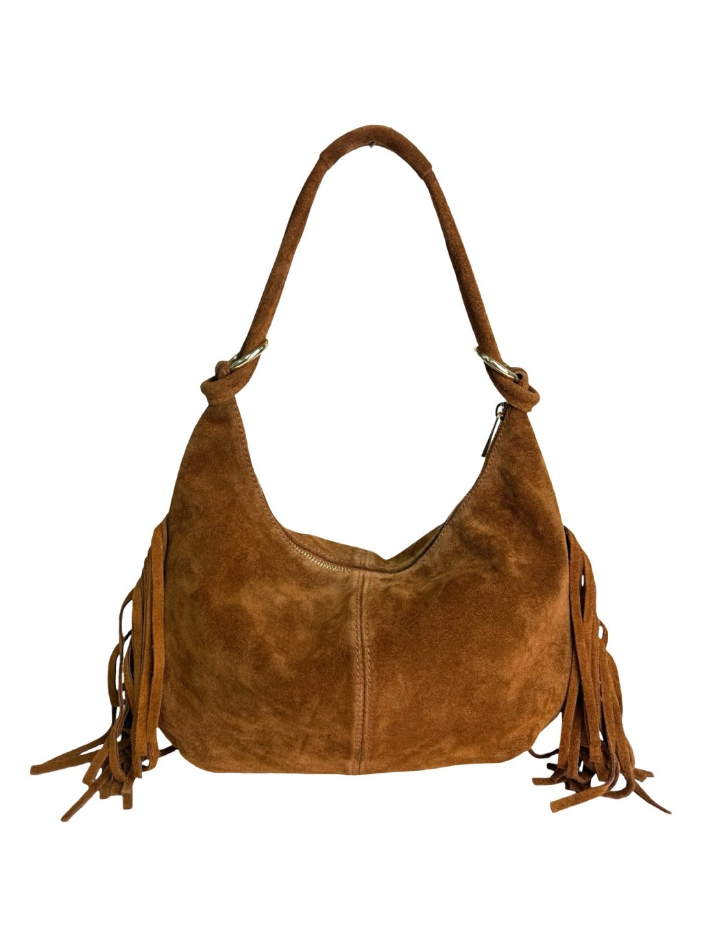 Kožená semišová kabelka gondola s třásněmi koňakově hnědá