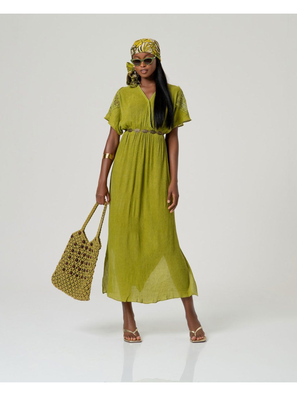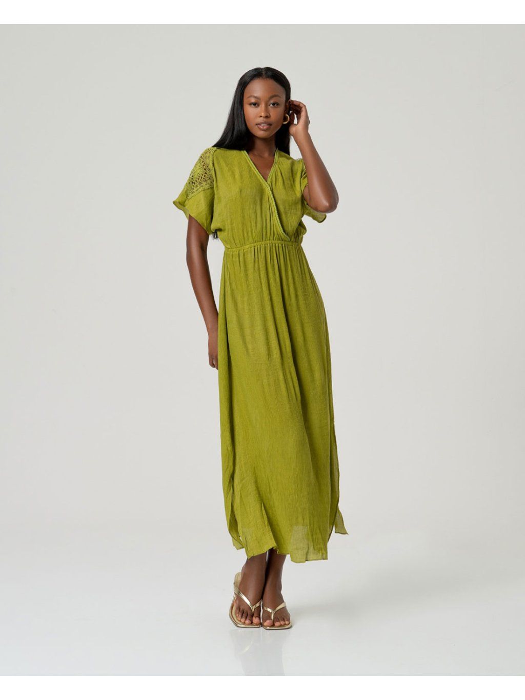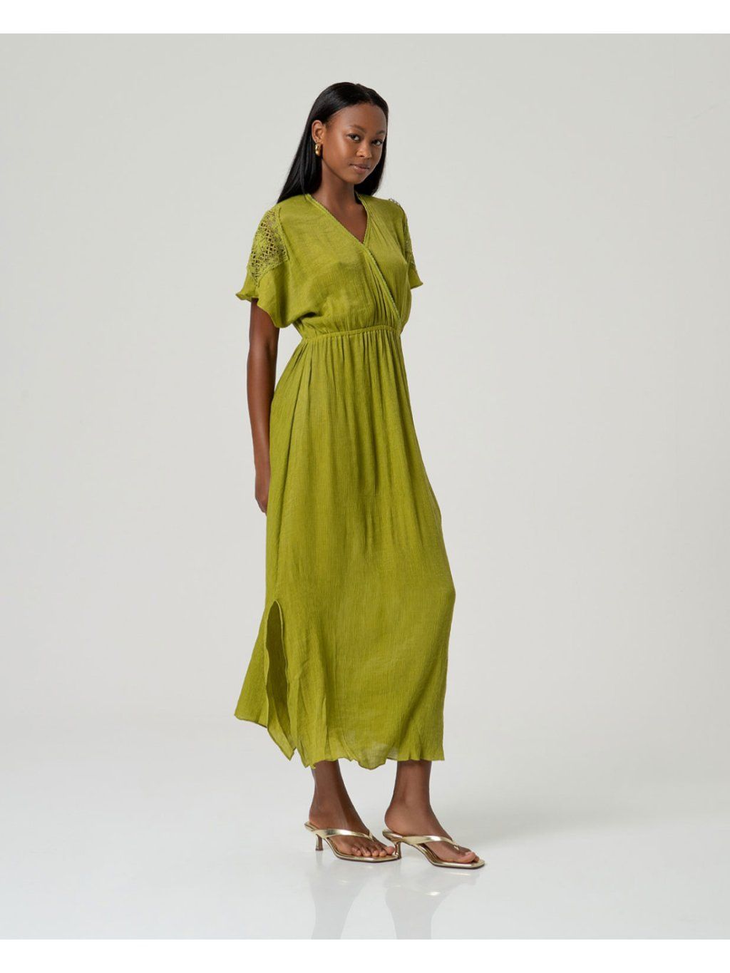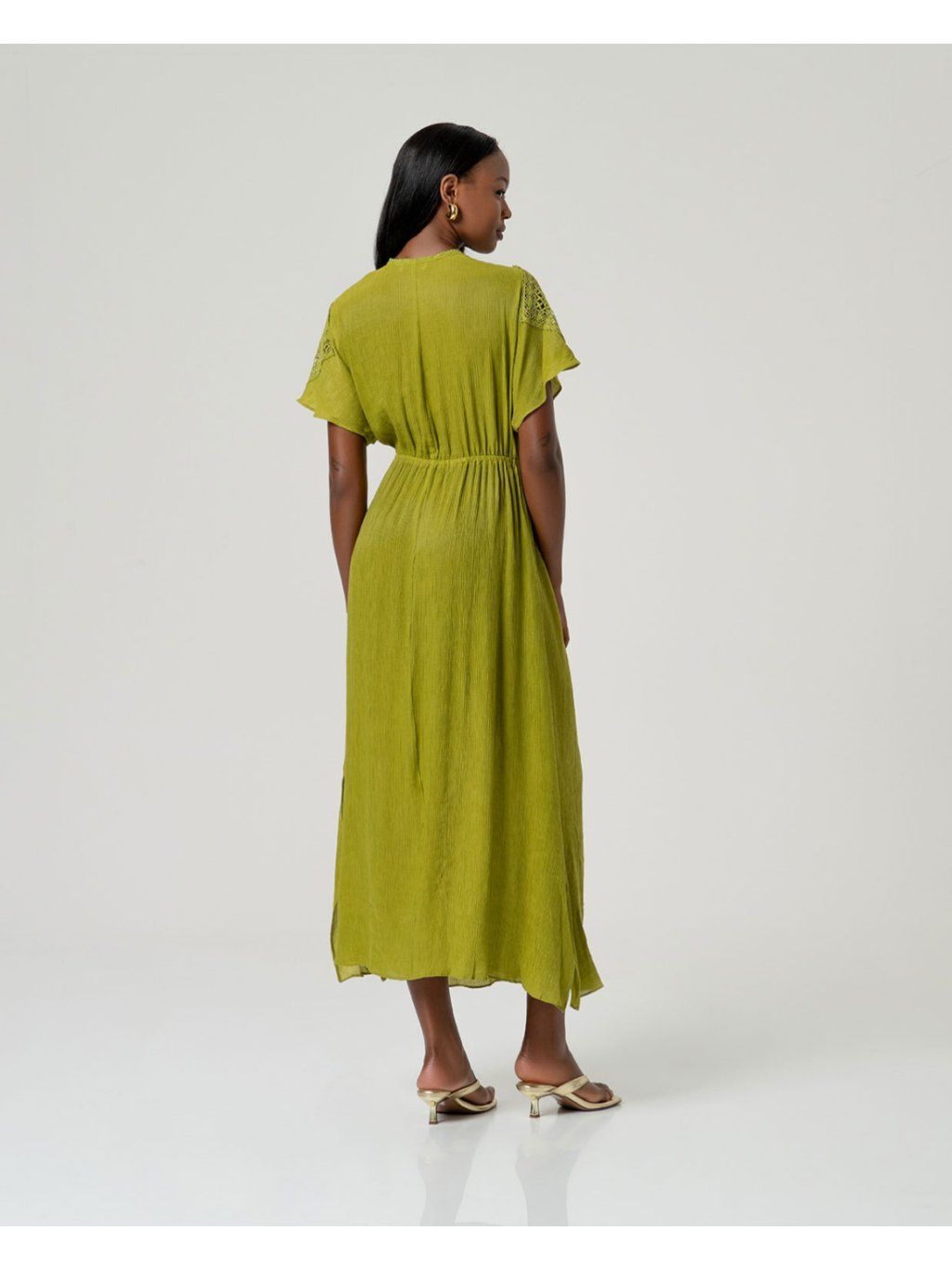 Surkana viskózové šaty s krajkovými rukávy zelené